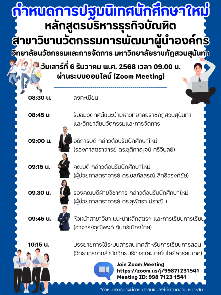 ![]() | ???? สาขาฯ จัดปฐมนิเทศนักศึกษาใหม่ ภาคเรียนที่ 2 ปีการศึกษา 2568 ???? วันเสาร์ที่ 6 ธันวาคม พ.ศ. 2568 เวลา 09.00 น. ???? ผ่านระบบออนไลน์ (Zoom Meeting) Join Zoom Meeting https://zoom.us/j/99871231541 Meeting ID: 998 7123 1541 |